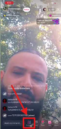 Once you’re live, locate the circular blue and pinkish icon at the bottom left. You can tap on it to invite others to join your live room as a co-host.